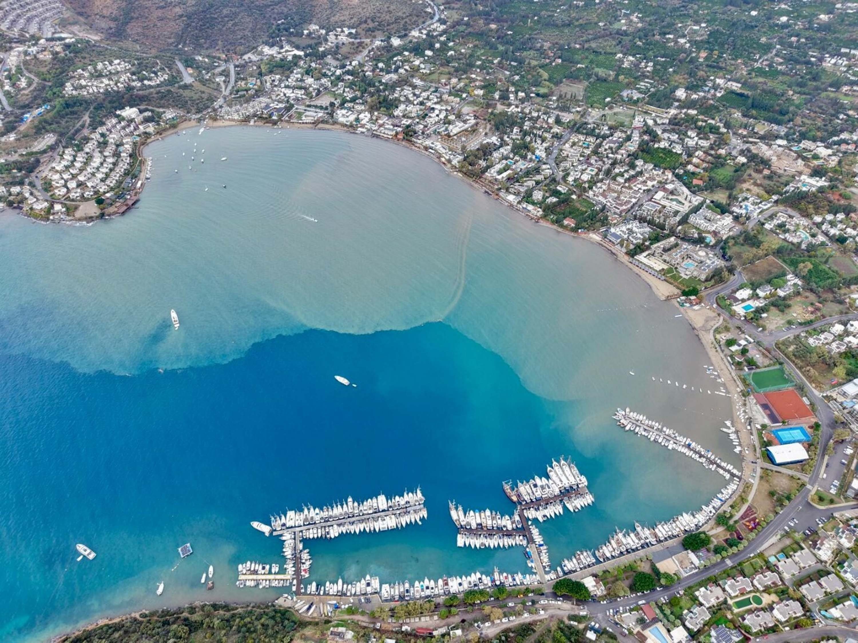 Bodrum’da etkili olan kuvvetli sağanak nedeniyle derelerden denize akan çamurlu su denizde renk değişimine neden oldu. Denizin bazı bölümleri kahverengiye döndü.